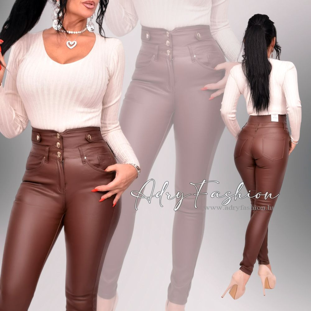 BARNA színű magas derekú aranygombos műbőr női nadrág