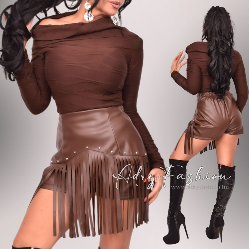 Barna puha műbőr shortos rojtos szegecses szoknyanadrág