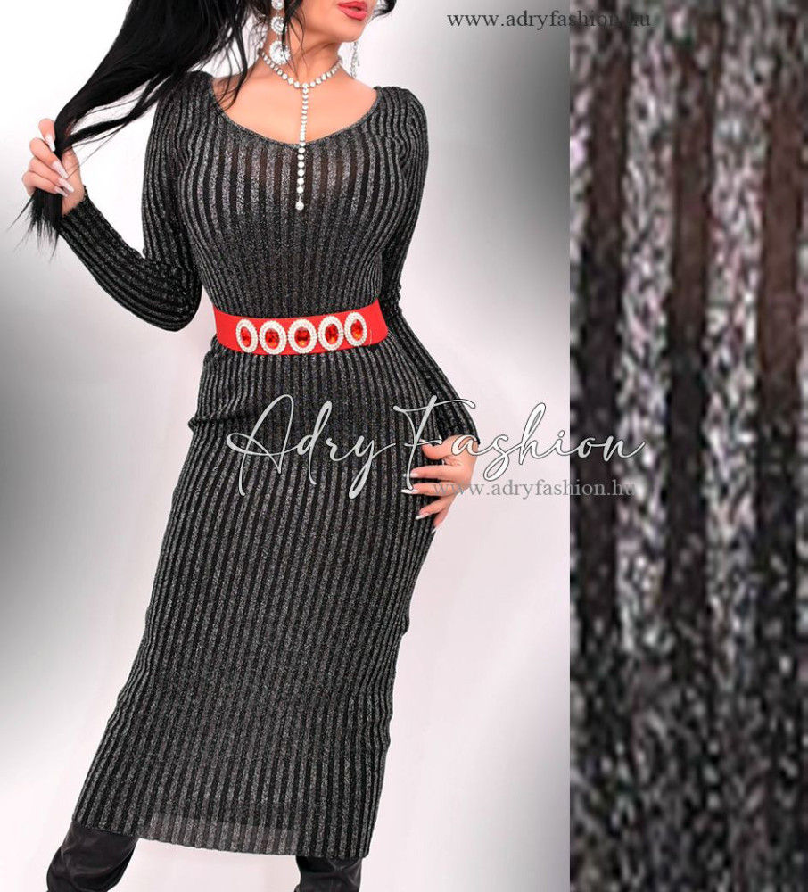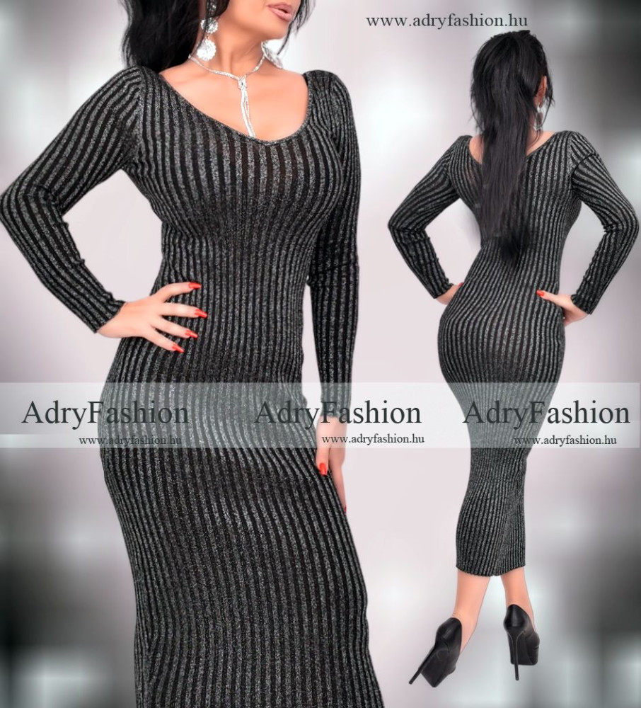 Fekete színű ezüst lurex szálas bordás v kivágott passzos női ruha