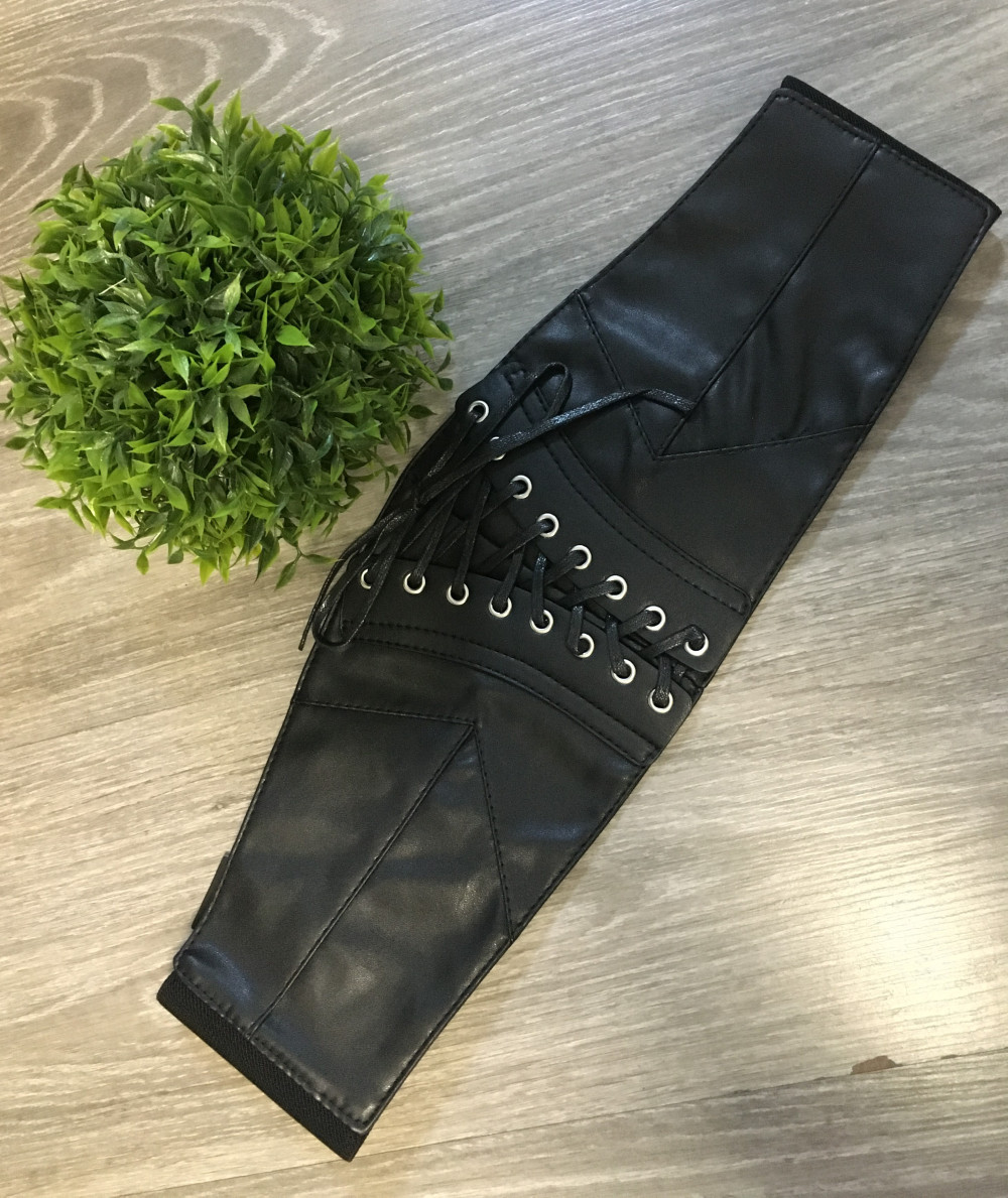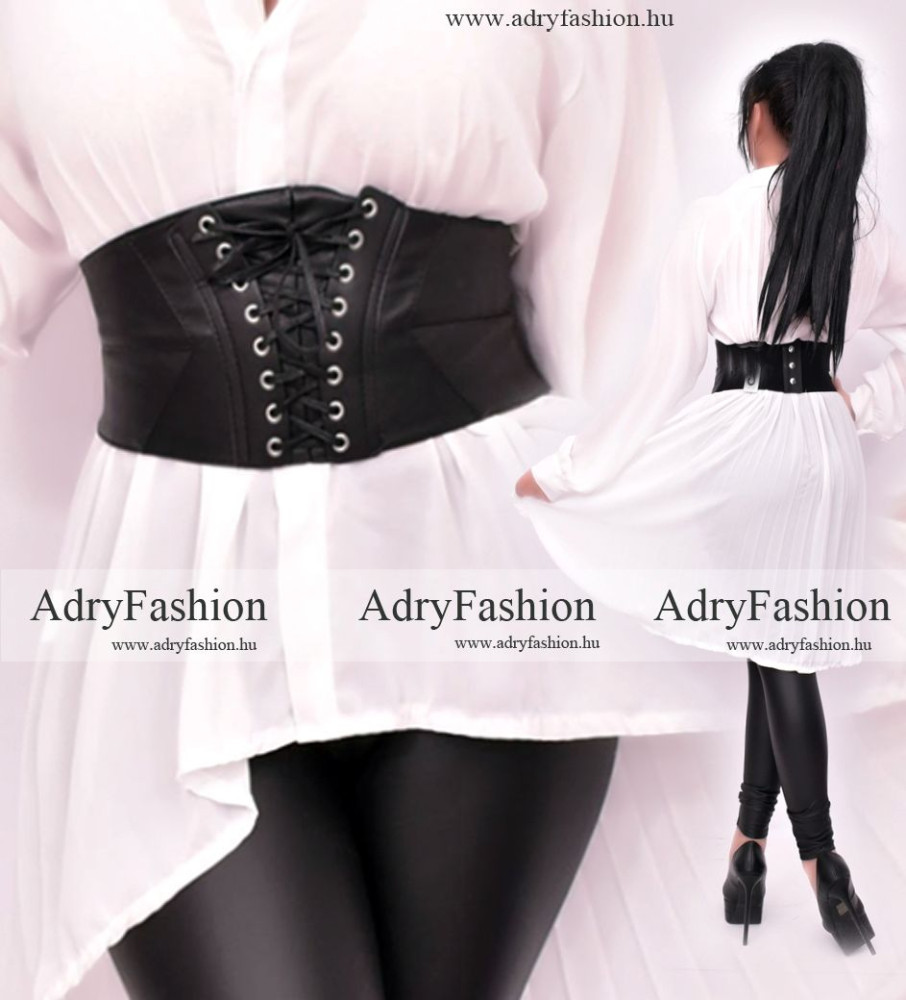 Fekete színű műbőr fűzős gumis öv hátul patentos