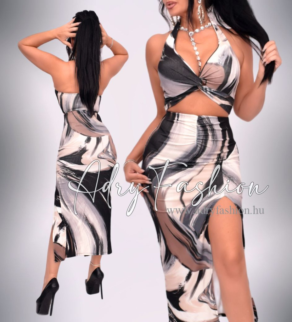 Fekete szürke bézs mintás bordás felső szoknya SZETT
