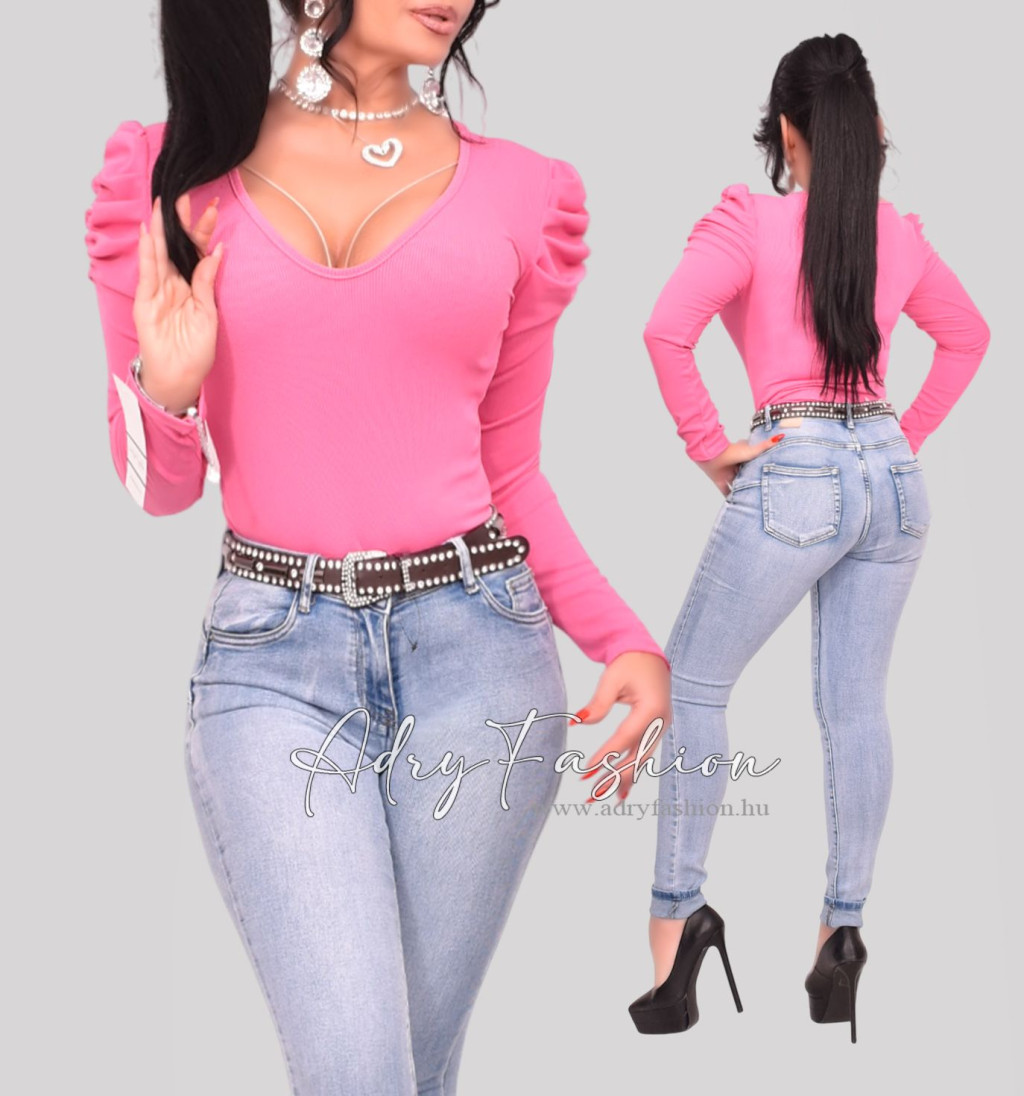 Kitty pink színű buggyos ujjú bordás felső V kivágott