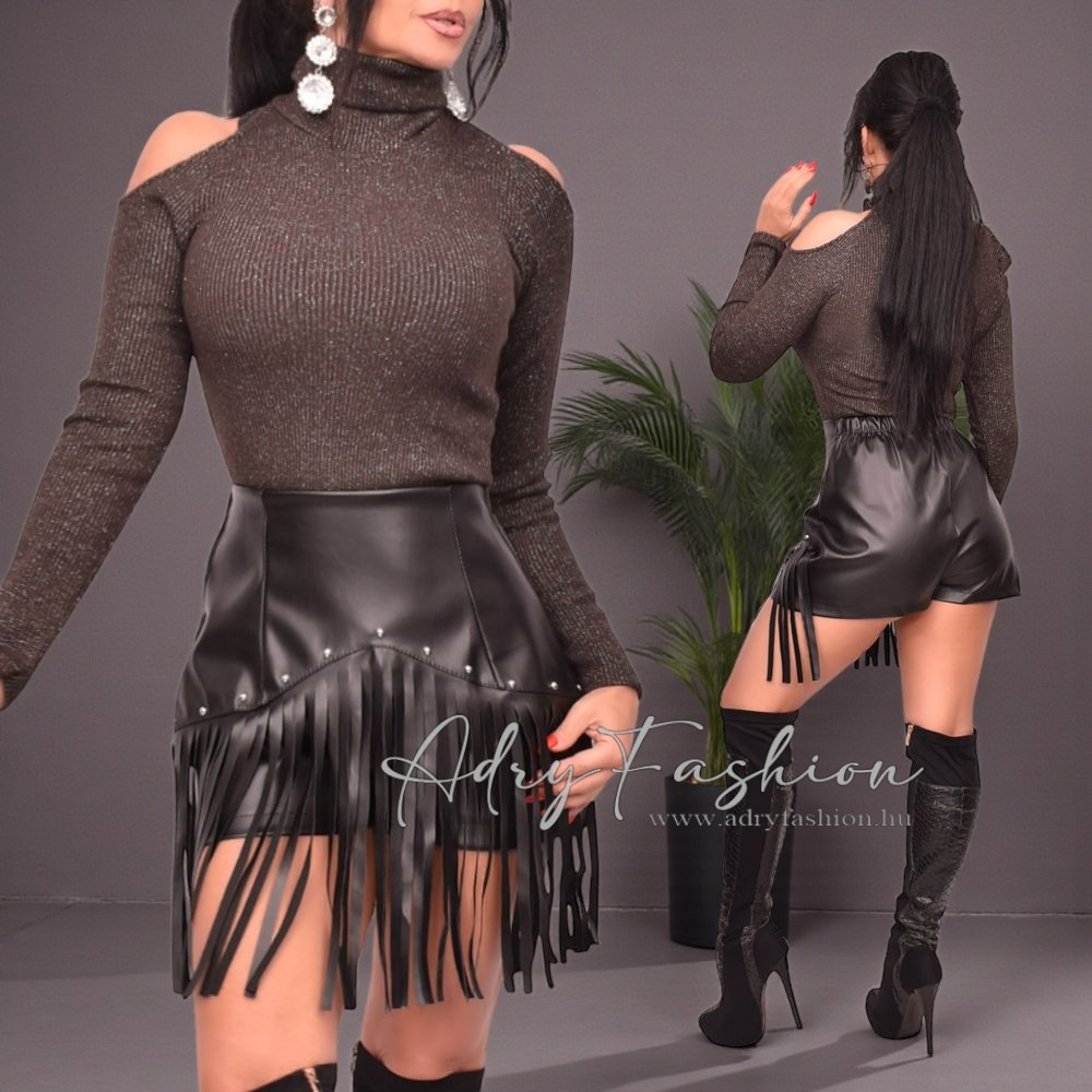 Panka Fekete puha műbőr shortos rojtos szegecses szoknyanadrág