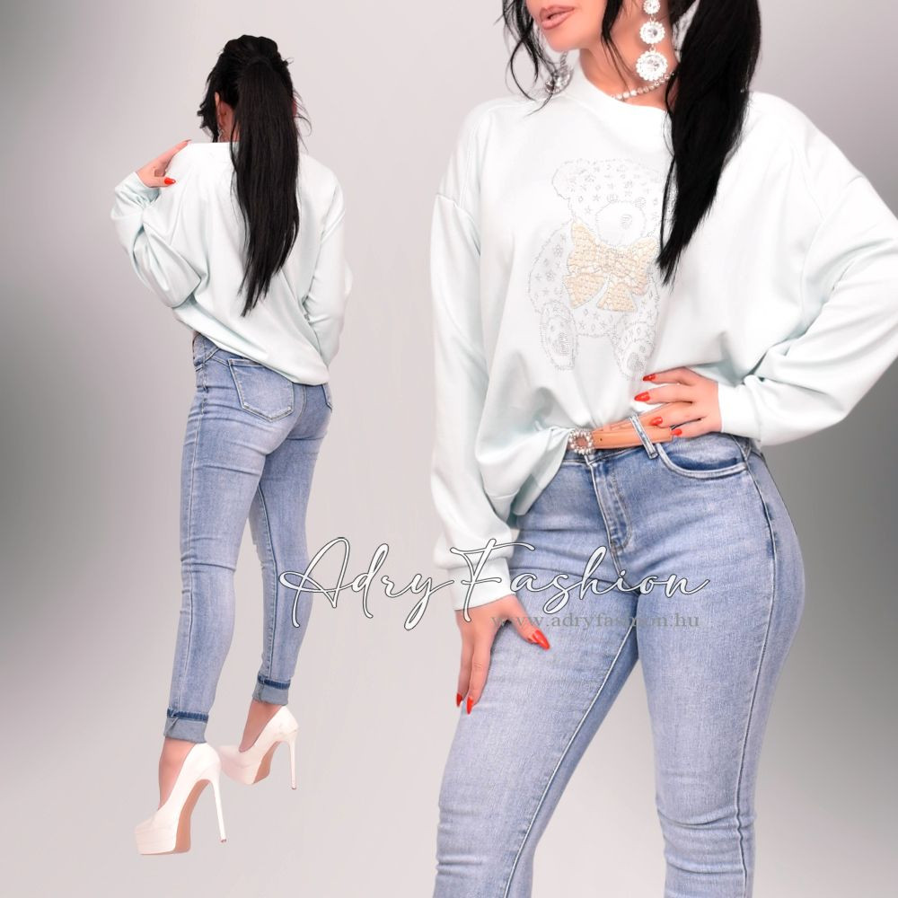 Türkiz zöld színű maci mintás strasszos női felső tunika