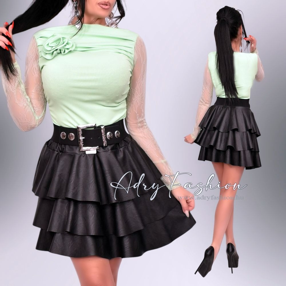 Zöld színű bordás csipke ujjú felső rózsabrossal